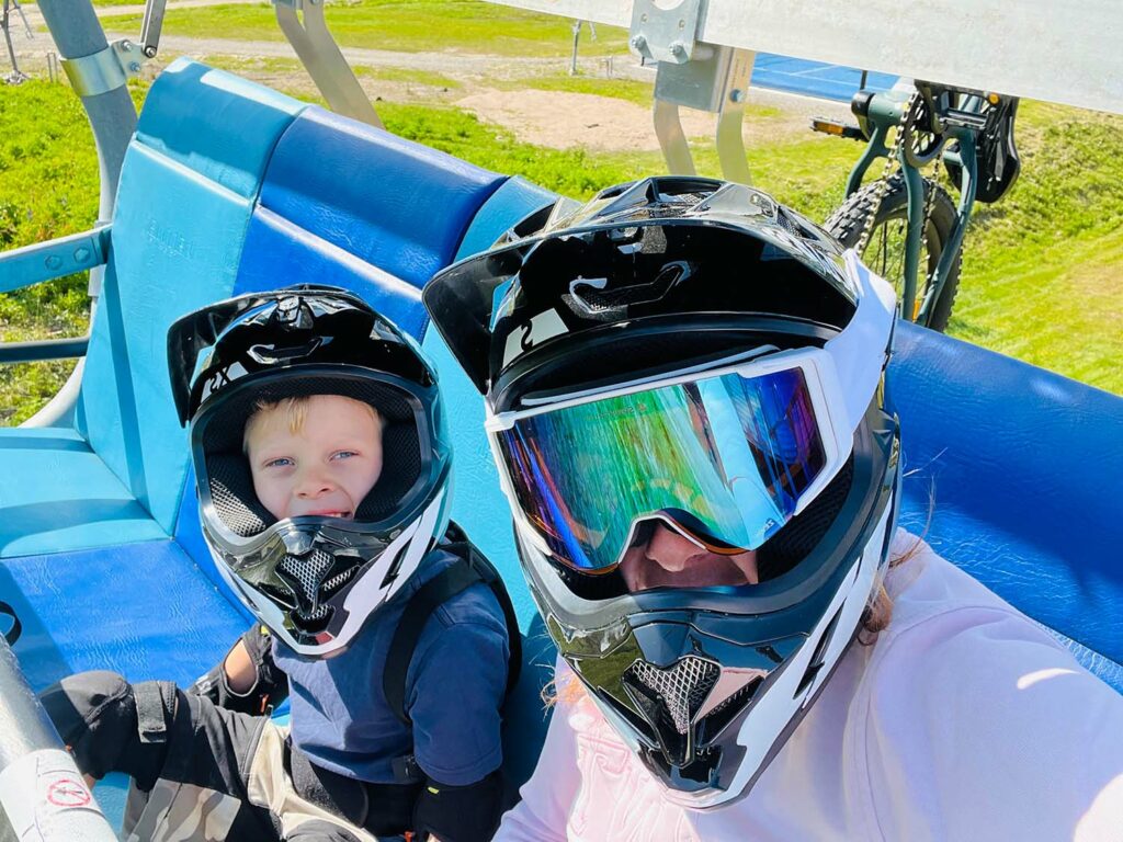 Detta var första gången som vi körde mountainbikes nerför. Så vi hyrde all utrustning på plats. Man kan enkelt och bekvämt boka utrustningen innan på deras hemsida. Sen gick vi bara och hämtade ut utrustningen innan liften öppnade. Allt står färdigt i rätt storlek med mountainbikes, ryggskydd, knäskydd, armbågsskydd, handskar och en cool hjälm. Sedan hade vi våra skidglasögon med oss.