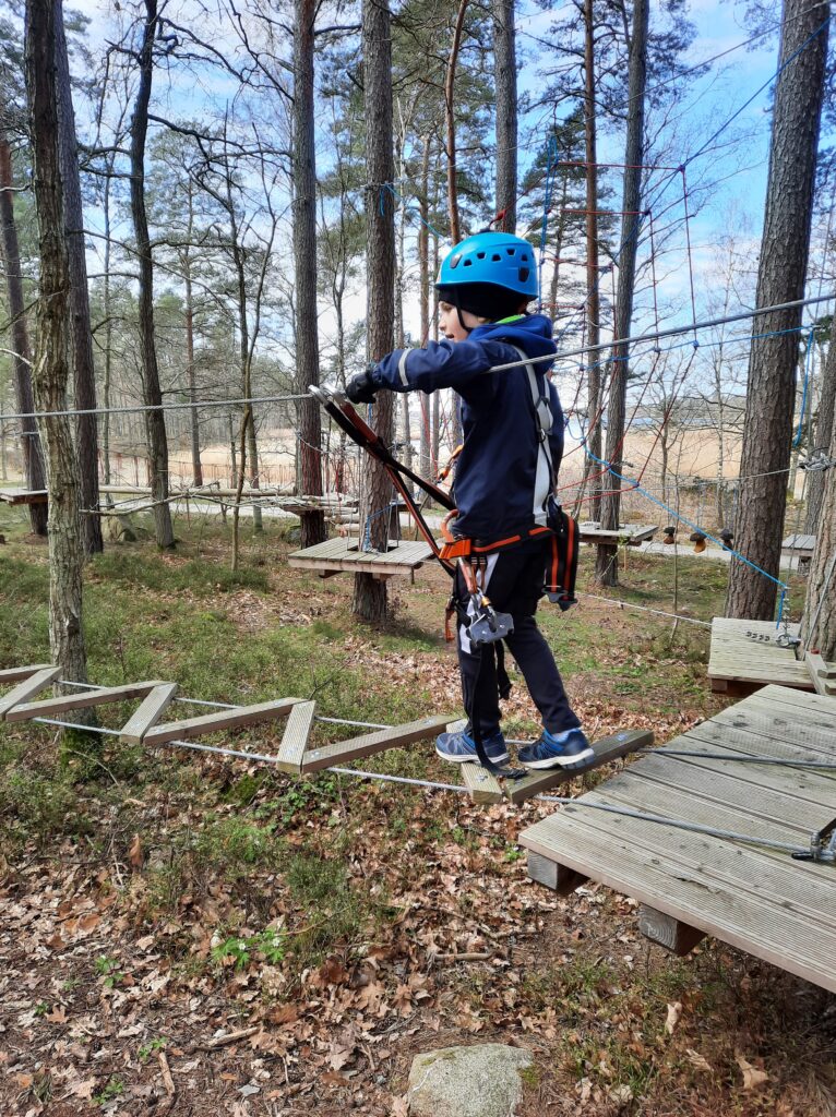 Pappa Lasse, Anton, 10 år, Tilda, 15 år och Ture, 7 år begav sig till Flyzone där man behövde vara över 125 cm lång. Flyzone hade en högsta punkt på 9 meter och den längsta linbanan var på 97 meter. På denna bana var det mest ziplines och det var superskoj för de äldre barnen. Ture fick dock avbryta då han tyckte det var allt för läskigt och blev nedhissad av en instruktör. Ture höll sig därefter i Kidszone med mig och Olle och där hade han jätteskoj. Tilda och Anton kunde röra sig fritt själva och fortsatte med att testa och utforska Fitnesszone där det fanns olika klätterväggar, hinder och ziplines med en högsta punkt på 8 meter. Här behövde man också vara minst 125 cm. Tiden gick snabbt och de hann aldrig med de mest utmanande banorna som heter Adventurezone och Riskzone så det är något som vi får testa på nästa gång vi besöker dem. För vi kommer besöka dem igen och det första barnen sa när det var slut var när vi skulle åka hit nästa gång. Så det måste man se som ett väldigt bra betyg.